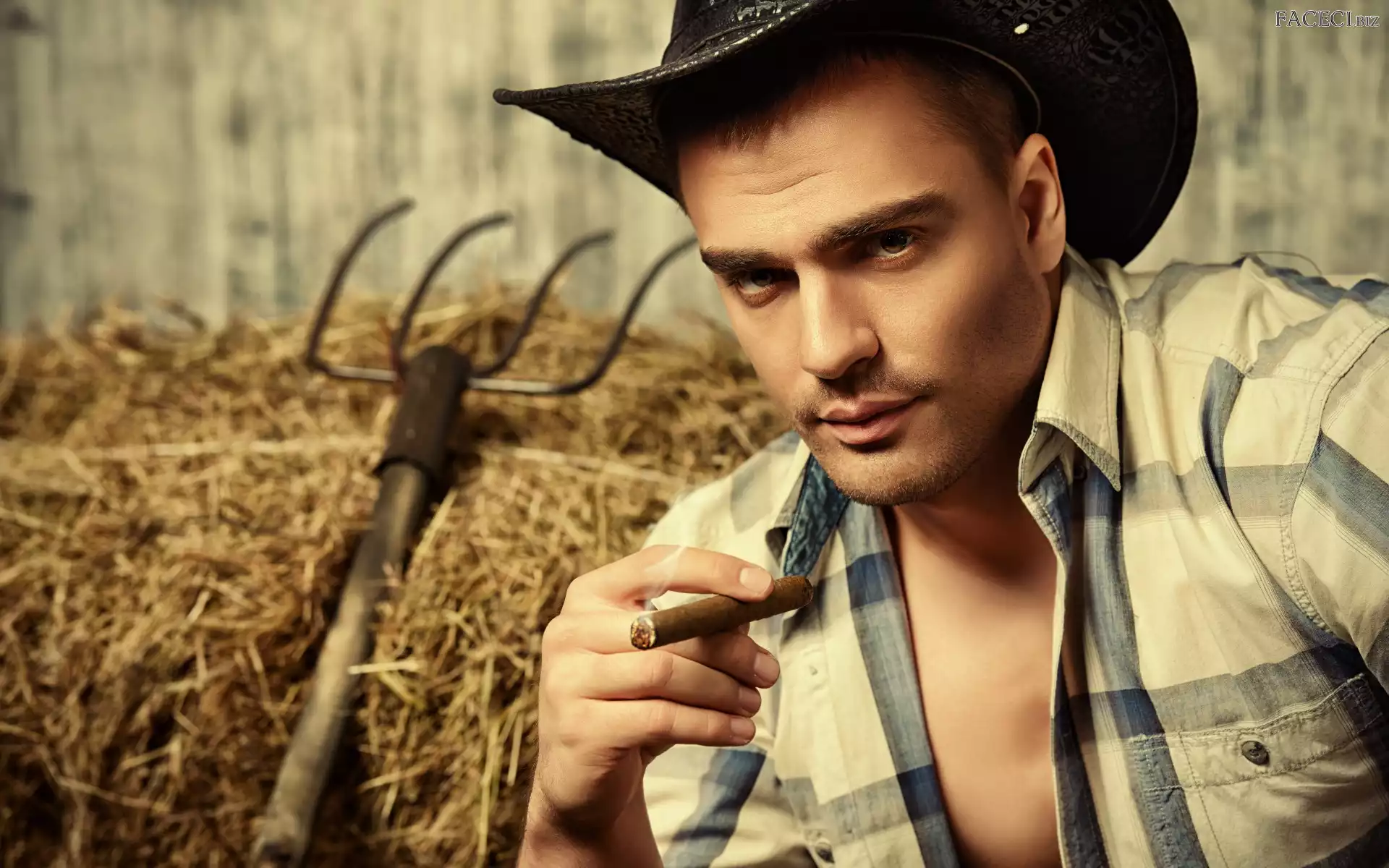 Kapelusz, Mężczyzna, Cygaro, Widły, Kowboj, Siano - faceci.biz